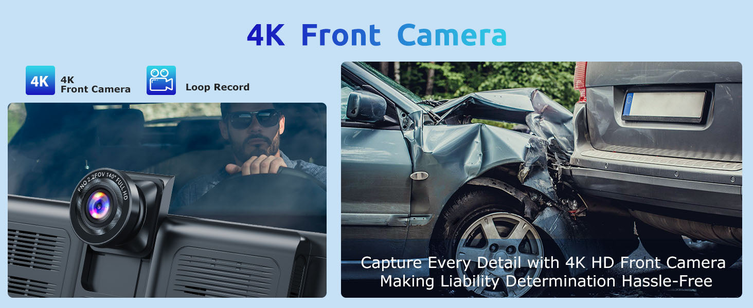 1. 4K Front Dash Cam + 1080P Reversing Camera: