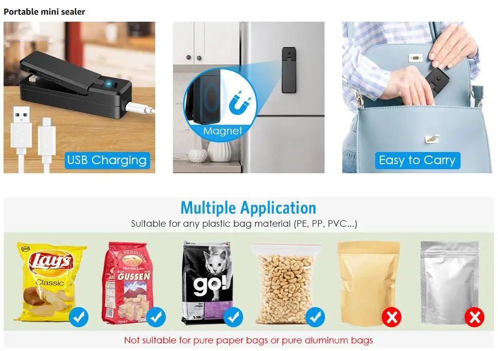 【Wide application】: Suitable for most plastic bag materials (paper is not applicable), such as aluminum foil heat seal bags, plastic snack bags, vacuum food storage bags, food packaging bags, PVC bags, can make chips, snacks and food to keep fresh, crispy, reduce food waste.