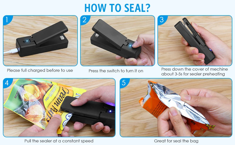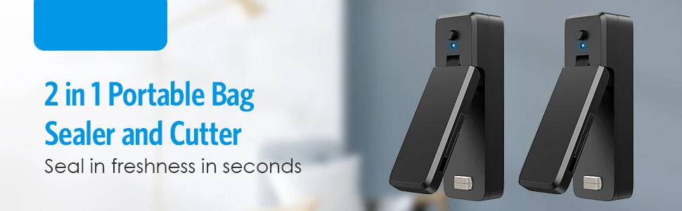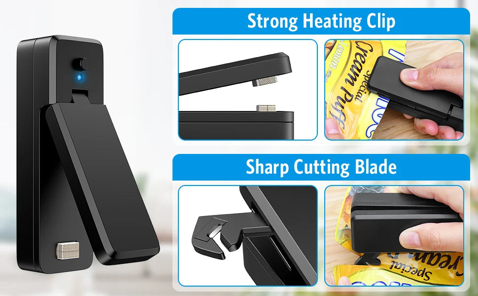 Introducing the Mini Bag Sealer 2 in 1, the rechargeable and portable solution for sealing and cutting plastic snack bags. Say goodbye to tape and clamps with this innovative device. Keep your snacks fresh on-the-go during outdoor picnics and campaigns. No more wasted chips - enjoy every last!